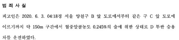 2020. 6. 3. 약 150m 구간을 혈중알코올농도 0.245%의 술에 취한 상태에서